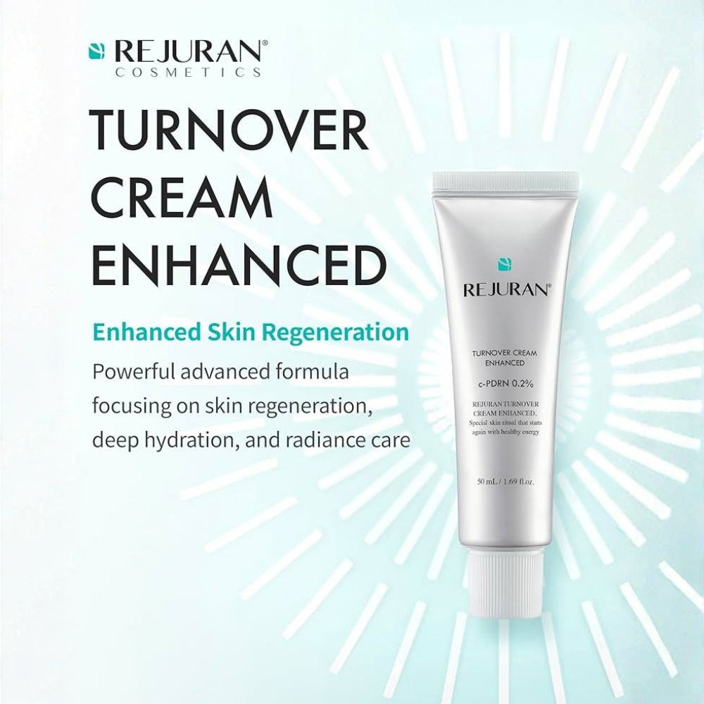 REJURAN Turnover Cream Enhanced is an advanced moisturizing face cream formulated with patented Salmon‑derived DOT c‑PDRN® (polynucleotide) technology to help stimulate skin renewal and improve texture. The formula aims to boost deep hydration, support the skin’s barrier, and leave skin looking smoother and more radiant.